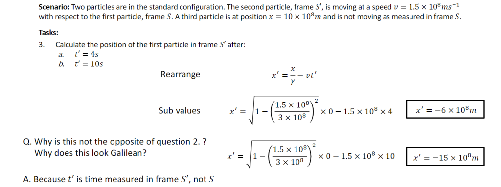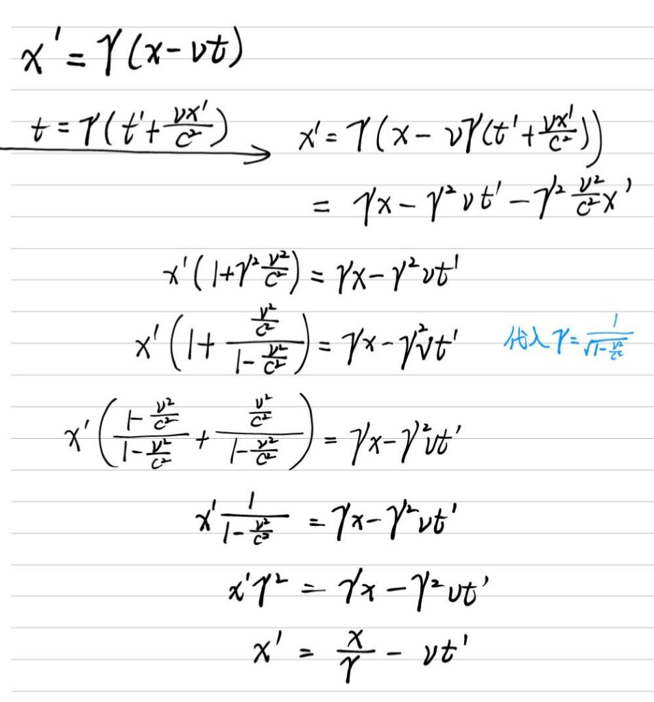 在这一问中,不能直接用 $x’ = \gamma(x – vt)$ 计算,原因在于该公式中的 $t$ 是 $S$ 系中的时间,而题目给出的是 $S’$系中的时间 \(t’\);由于 $S$ 系中的$ t$ 未知,直接使用 $x’ = \gamma(x – vt)$无法代入计算