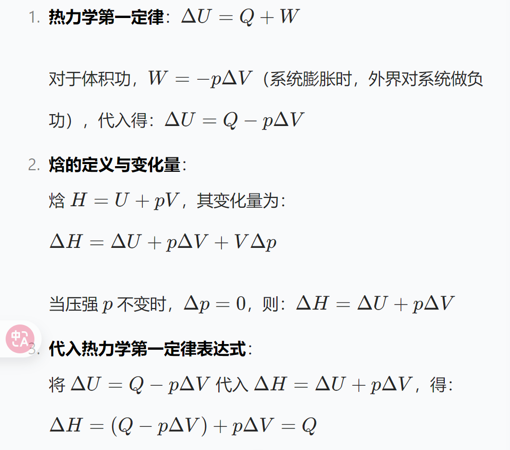 在压强 p 不变时,焓的变化量 $\Delta H$ 等于系统吸收的热量 Q,即 H(焓)在 p 不变时体现为吸收的热量