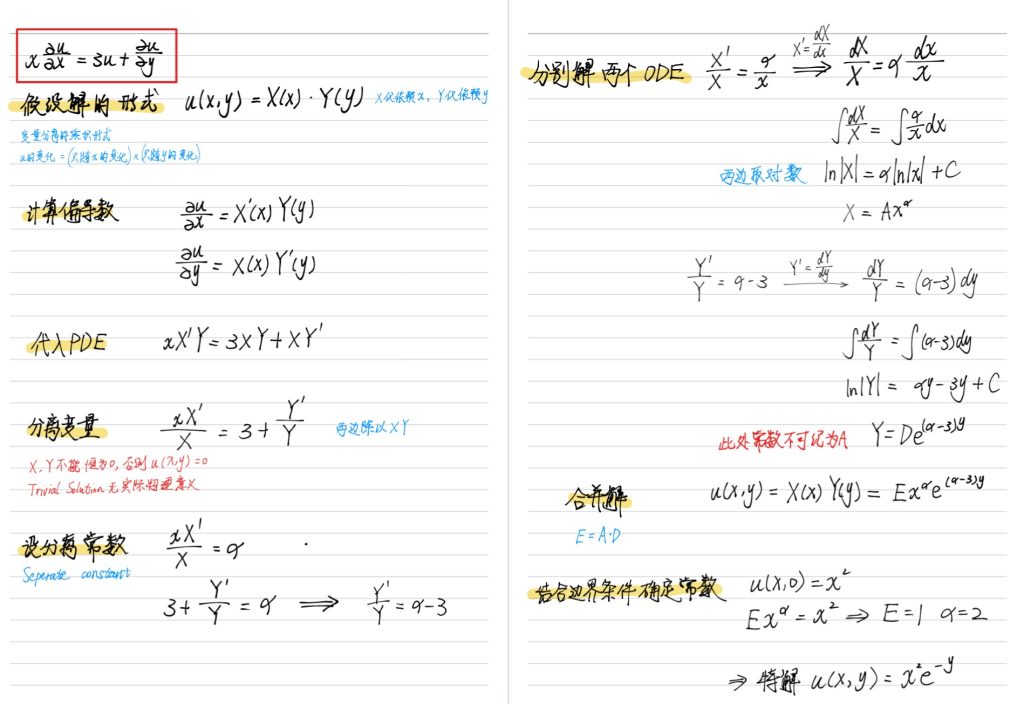 - Linearity,幂次→乘积:偏导数和因变量的Exponent决定方程的Linearity,二者的幂次需要均为「1 次」;而自变量的exponent则不影响;此外,Linear要求方程也无因变量和偏导数的乘积,即需因变量及其偏导出现在不同项;除此之外,若含非线性函数如$\sin u$,仍然属于non-linear PDE.