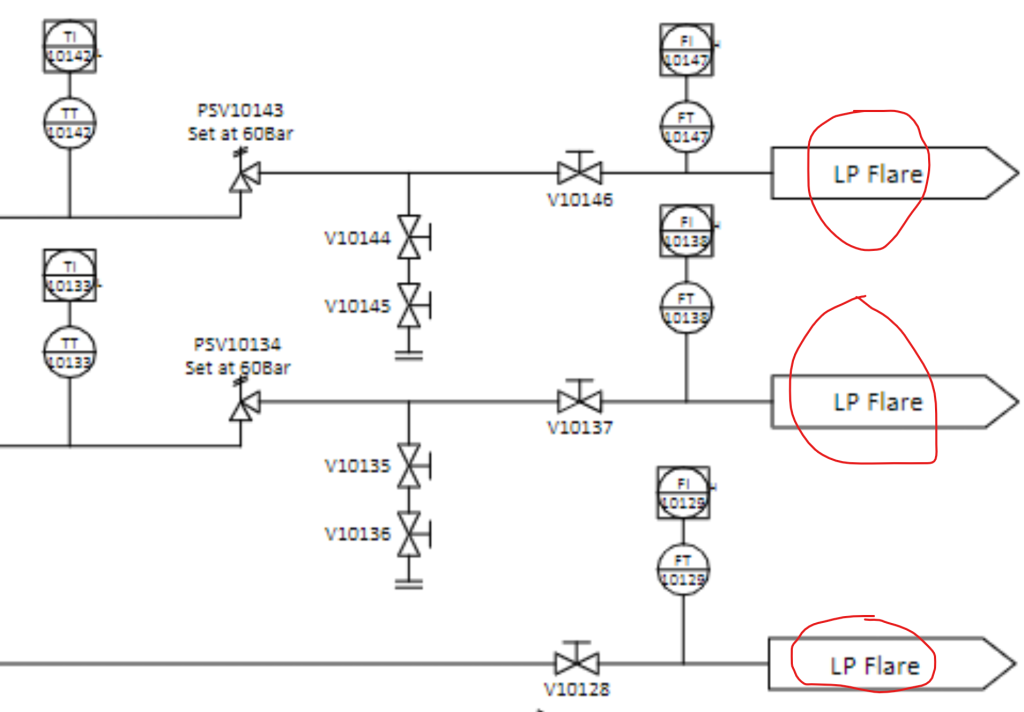 - PSV10134:同样设定压力 60 bar,也连接到 LP Flare