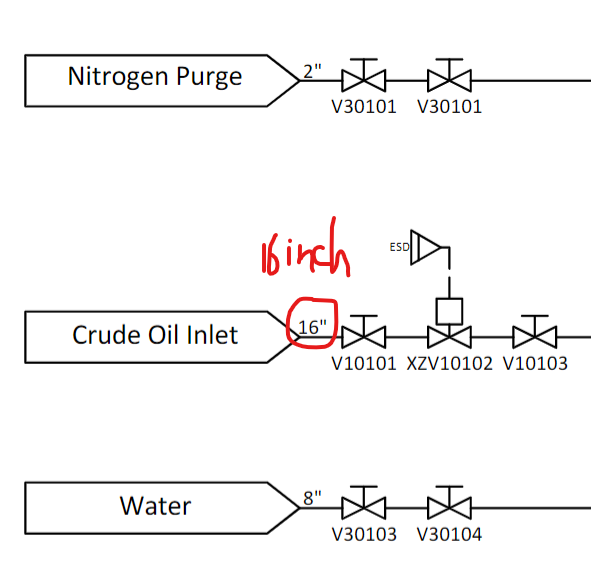 - 16 英寸的原油入口把 “原油混合液” 送进 V-101(三相分离器)