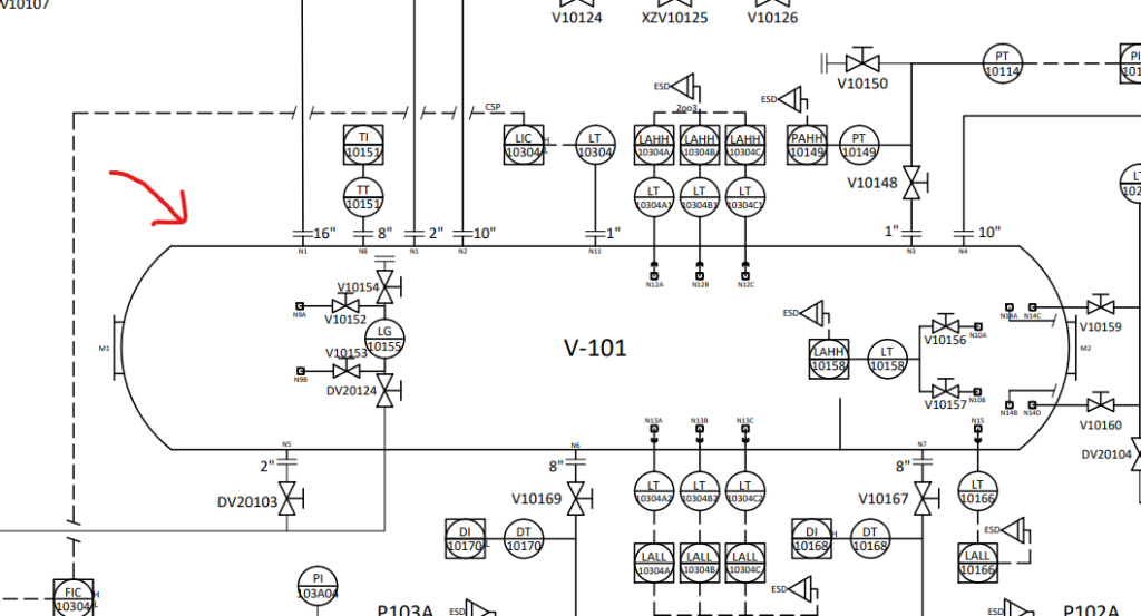 - 工艺描述:原油(Crude Oil,275 t/hr)进入 V-101,通过重力沉降分离为天然气(Natural Gas)、冷凝油(Condensate)、产出水(Produced Water),分别经 10″、8″、8″ 管线输出;