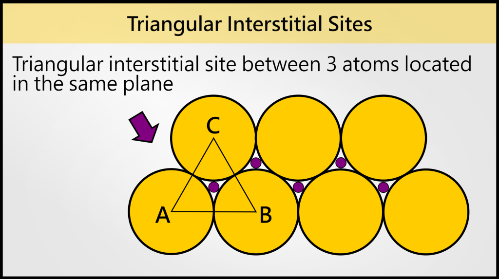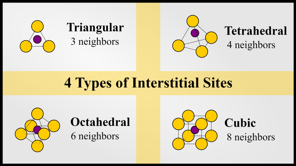 Depending on the number of atoms surrounding that empty space, the interstitial site can be designated as triangular (3), tetrahedral (4), octahedral (6), or cubic (8).