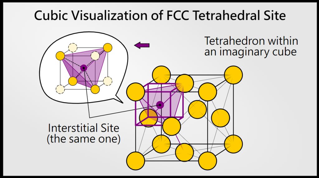 四面体位由4个原子包围,形成 regular tetrahedron;在FCC中,这些位点位于单元胞的每个 corner 附近;具体来说,每个 orner atom 上方或下方有一个四面体位,但由于对称性,每个单元胞的8个角各贡献一个位点.