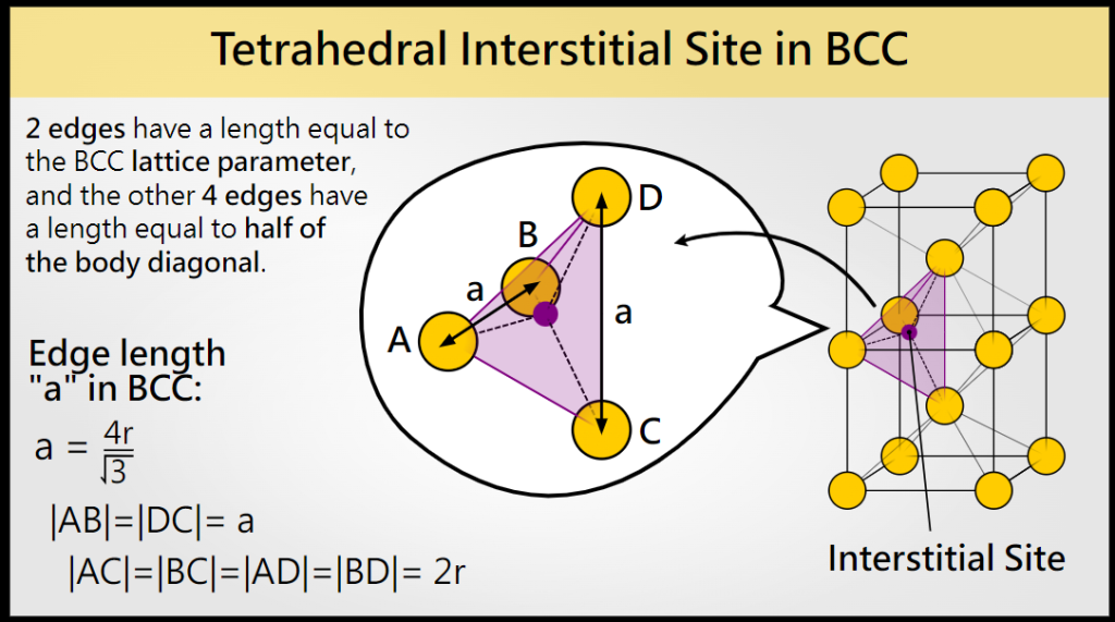 注意: BCC没有“体内部”(body interior)的四面体位,因为体心原子占据了中心空间;这些位点“贴近”面,但几何上由体心原子参与包围.