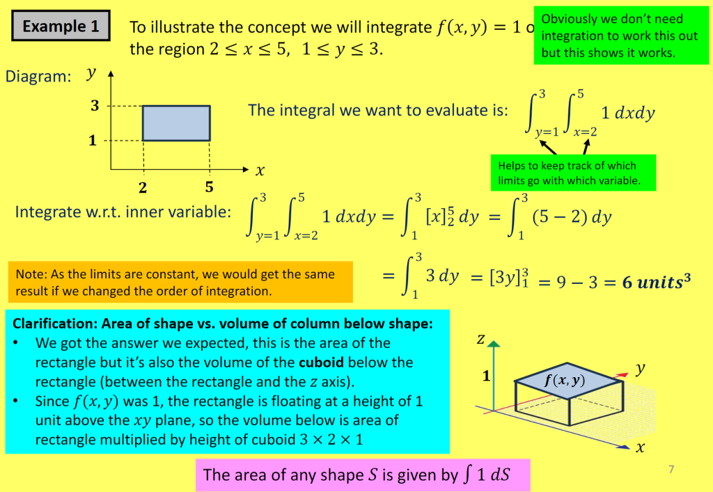 $$\int_{y=1}^{3} \int_{x=2}^{5} 1 dx dy = \int_{1}^{3} [x]_{2}^{5} dy = \int{1}^{3} 3 dy = [3y]_{1}^{3} = 6$$
