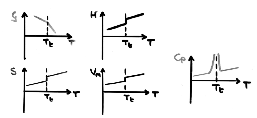 也就是说,在一级相变发生时,系统的熵(Entropy, S)和体积(Volume, V)会发生突变。