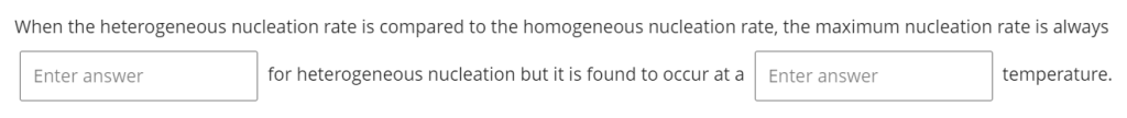 | 形核速率与过冷度的关系 | 文档3(CAPE2710 Week5.pdf)Week5 Task2 | e-book page121 | “At low ΔT, ΔG* and r* are large because the driving force ΔGv is small → Ihom is vanishingly low; As ΔT increases, ΔGv increases causing ΔG* and r* to fall → Ihom rises sharply” |