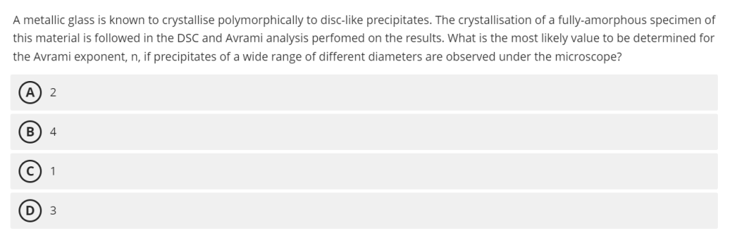 金属玻璃(metallic glass)多晶型结晶(polymorphically crystallise)时,因沉淀相为盘状(disc-like precipitates,2D生长),且观察到“宽范围直径的沉淀”说明为随机形核(sporadic nucleation),根据Avrami指数(Avrami exponent, n)的判定规则,2D生长+随机形核对应的Avrami指数为3。