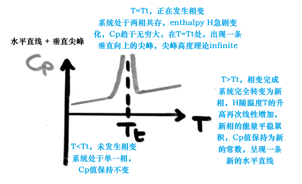 定压比热容 Cp 是焓 H 对温度 T 的 First-Order Partial Derivative ;物理上,正因为 First Order Phase Transformation 中焓 H 不连续(Discontinuous),导致 Cp 也不连续,表现为相变温度处的垂直尖峰(Infinite Peak).