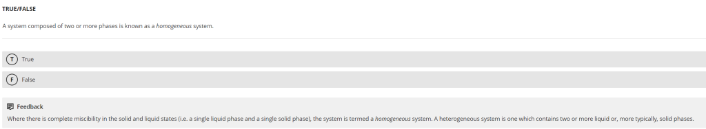 - Feedback 翻译:“当在固态和液态下完全互溶(complete miscibility)时(即单一液相和单一固相),该体系被称为均相体系。非均相体系是指包含两个或多个液相,或更常见的是两个或多个固相的体系。”