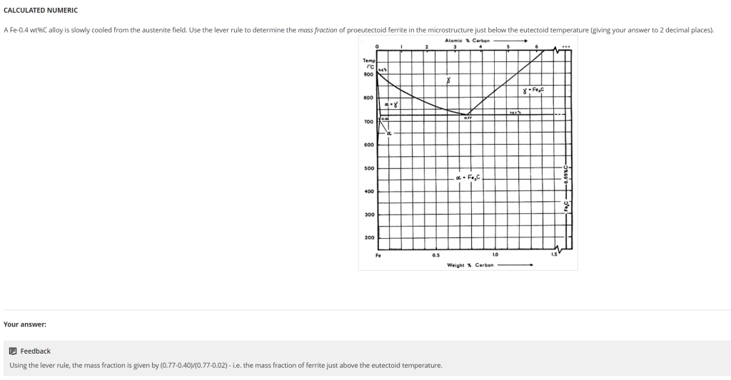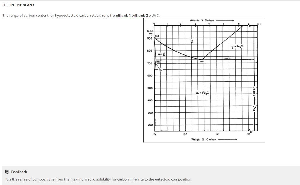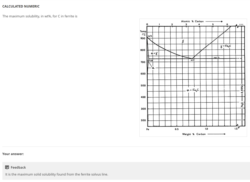 - 铁素体定义与最大溶解度数值:Week 3 文档(2710 Week 3.pdf)Task 2“THE EUTECTOID TRANSFORMATION”,e-book pages 55-65(Fe-C相图左下方α相区标注“0.022 wt% C”)