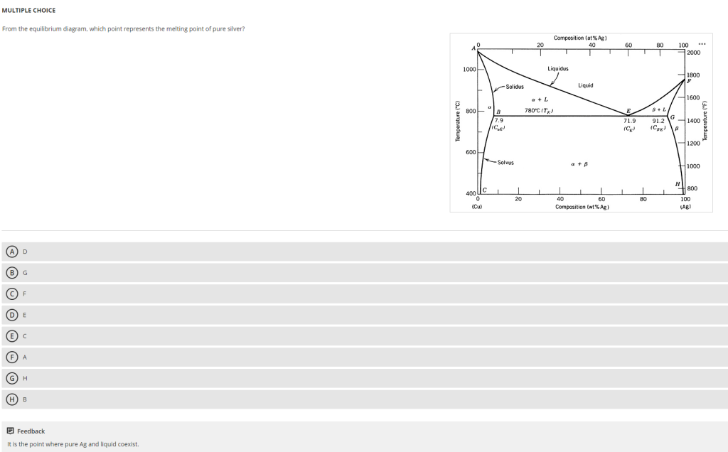 - 选项D(E点):是共晶点(eutectic point),对应共晶温度,不是纯银熔点;