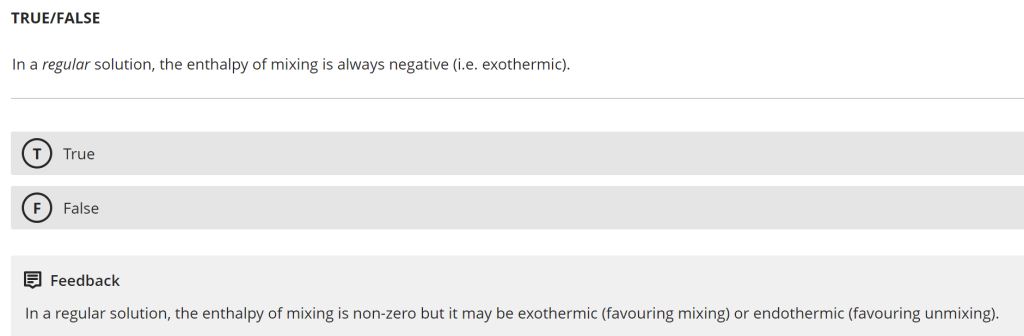 这道题的答案是 False(错误)。核心逻辑:正规溶液(regular solution)的混合焓(enthalpy of mixing, ΔHmix)并非“总是为负(放热,exothermic)”,而是非零(≠0),可根据原子间相互作用呈现放热(ΔHmix<0)或吸热(ΔHmix>0)两种情况