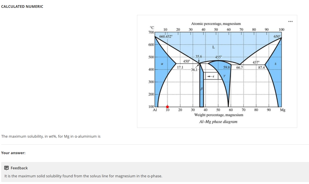 | 最大溶解度 | Maximum Solubility | 平衡状态下,溶质(Mg)能溶解在溶剂(α-Al)中的最高重量百分比,对应相图中α相区的固相线(solvus line)最高点。 | Week 1 文档(2710 Week 1.pdf)Task 1“Solubility limit”,e-book pages 1-8(溶解度极限定义) |